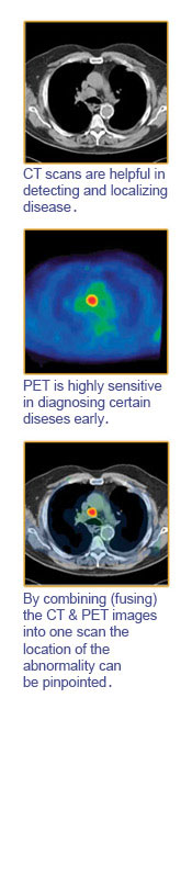 The PET scan pinpoints abnormally elevated metabolic activity in cells, and the CT exam provides an anatomical reference for the PET findings. When these two scans are fused together (PET/CT), the exact location of the abnormality can be pinpointed which in turn facilitate treatment.